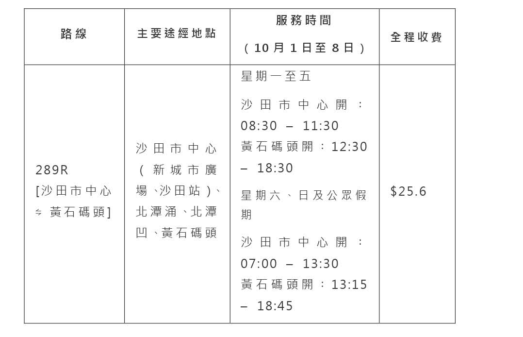 香港文匯報訊 內地國慶黃金周明日(10月1日)開始,九巴預計萬宜水庫、西貢郊區等將繼續成為遊客必到景點之一,期間會加強多條往返西貢郊區的路線。其中路線289R「沙田市中心←→ 黃石碼頭 」將於10月1日至10月8日期間每日提供服務,經由羅湖口岸或福田口岸抵港的旅客,可於乘搭過境鐵路到沙田站後,於鄰近的沙田市中心巴士總站乘坐路線289R,只需約40分鐘車程便直達北潭涌,繼續前往黃石碼頭或接駁其他交通工具前往萬宜水庫東壩。