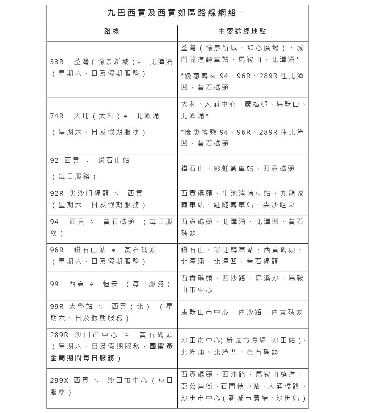 此外,九巴亦會視乎乘客需求,加強路線92「西貢←→鑽石山站」、94「西貢←→黃石碼頭」及96R「鑽石山站←→黃石碼頭」的服務。