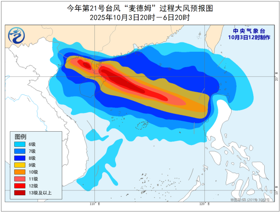 大风预报:3日夜间至6日白天,广东雷州半岛和中西部沿海、广西沿海、海南岛及沿海、西沙群岛、中沙群岛、黄岩岛附近海域将有6~8级风,南海中北部、琼州海峡、北部湾中北部有9~11级风,“麦德姆”中心经过的附近海域或地区风力可达12~14级、阵风15~17级。
