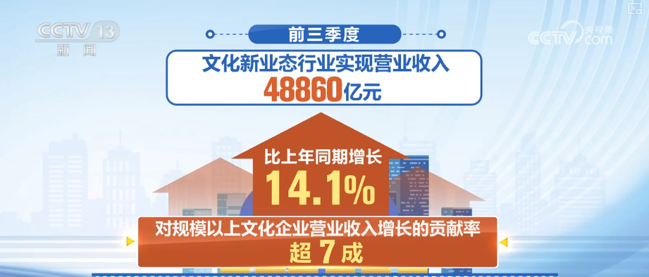 互联网搜索服务、数字出版等文化新业态行业持续快速发展。前三季度,实现营业收入48860亿元,比上年同期增长14.1%,对规模以上文化企业营业收入增长的贡献率超七成。