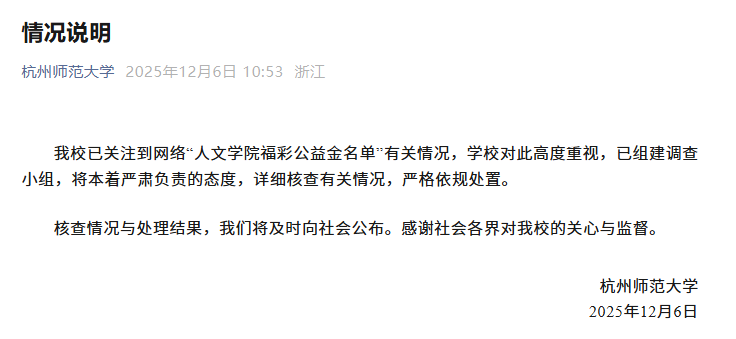 中国网12月6日讯杭州师范大学12月6日发布情况说明:我校已关注到网络“人文学院福彩公益金名单”有关情况,学校对此高度重视,已组建调查小组,将本着严肃负责的态度,详细核查有关情况,严格依规处置。核查情况与处理结果,我们将及时向社会公布。