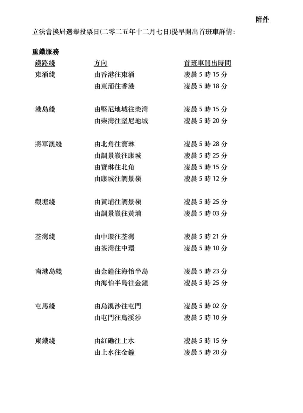 香港第八屆立法會選舉將於明日(7日)舉行。為配合選舉日,港鐵發布通告,指大部分綫路會於明日早上提早開出頭班車,以便票站人員前往票站作準備,並呼籲大家齊投票。以下為車次時刻表: