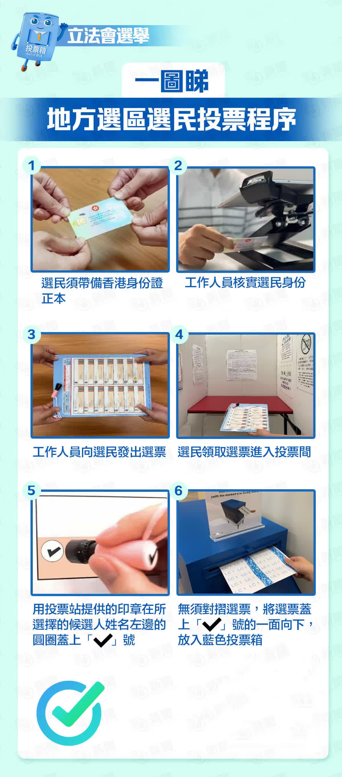 要注意,地方選區的選民只能投給一位候選人,也就是選票上只能蓋上一個「✔」號。另外,若不慎填錯或損壞選票,請將原選票交還投票站主任,換取新選票重新填寫。