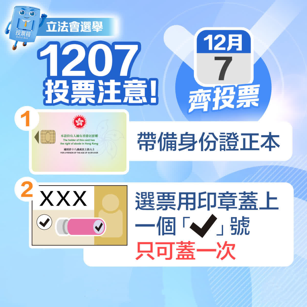 12月7日是立法會選舉投票日,請大家踴躍投票,選出最適合的立法會議員,與政府各界凝心聚力,共同創建更安全、更美好的未來。