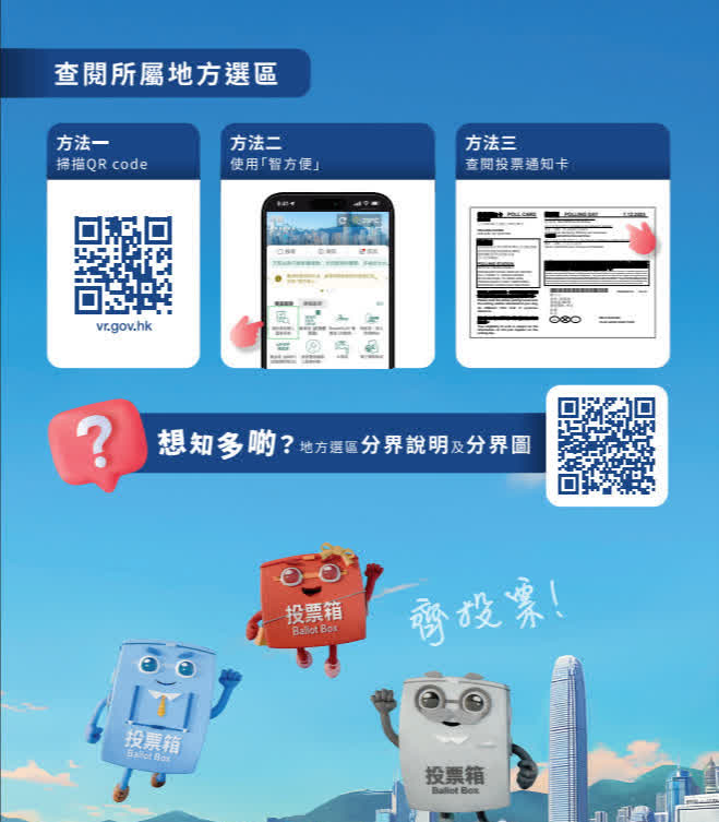政府早前已向逾413萬名已登記選民寄出投票通知卡,選民只可在投票通知卡上列明的投票站投票。選民記得留意信箱或網上查詢去哪個票站投票。