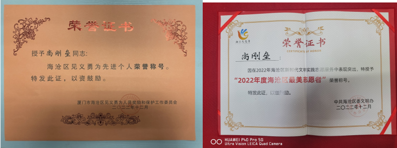 此后,尚刚垒被授予“厦门市海沧区见义勇为先进个人”荣誉称号。同年,因在2022年海沧区新时代文明实践志愿服务中表现突出,他还被评选为“2022年度海沧区最美志愿者”。