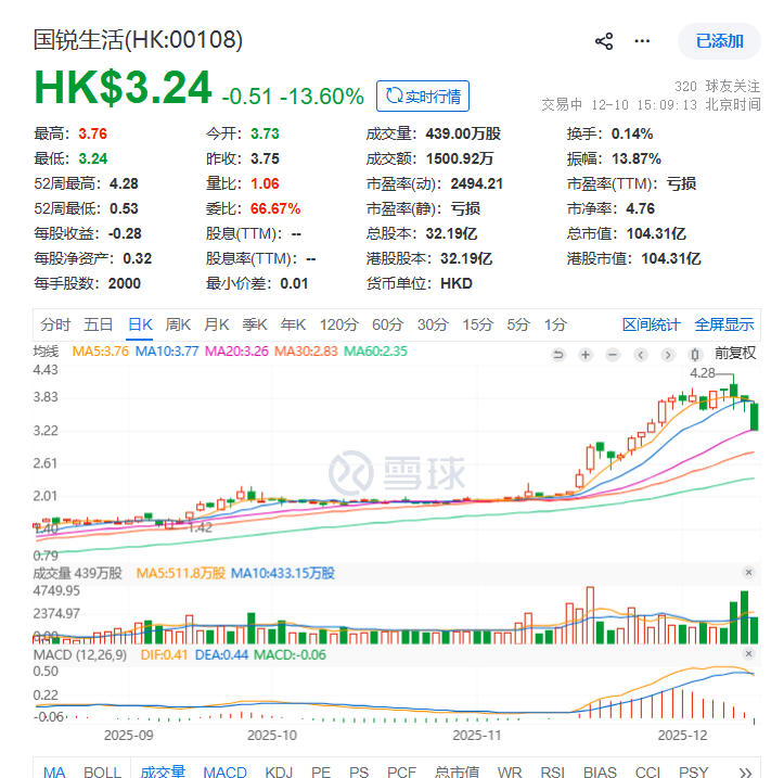 乐居财经 李兰 截至12月10日下午15:09,国锐生活股价跌13.6%,总市值为104.3亿港元。