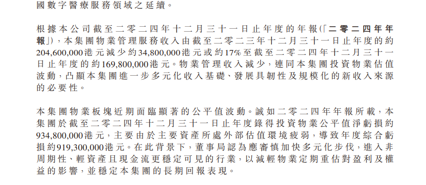 国锐生活表示,物业板块近期面临显著的公平值波动,集团2024年投资物业公平值净亏损约9.348亿港元。在此背景下,董事局认为应加快多元化步伐,进入非周期性、轻资产且现金流更稳定可见的行业,以减轻物业定期重估对盈利及权益的影响。