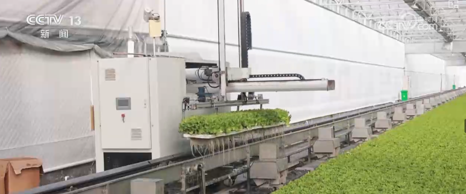 在兰陵县的这个智能连栋温室里,种植了2万平方米的生菜。成熟后的生菜通过温室内的自动传送系统送到加工车间,这里只需要5个工人就可以完成生菜挑选、打包等工作。