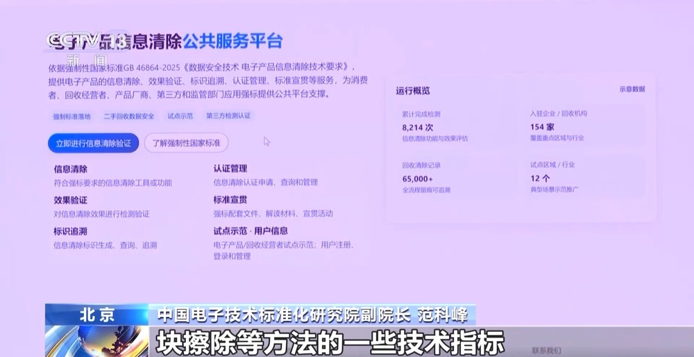 中国电子技术标准化研究院副院长 范科峰:消费者处理旧手机时常面临“三怕”:怕操作复杂、怕删除不掉、怕回收不规范,强制性国家标准提供一站式解决方案,让电子产品厂商提供信息清除途径,包括内置清除功能、免费服务或第三方清除工具,消费者无须自行摸索。