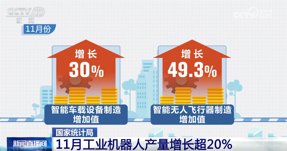 此外,国家统计局新闻发言人在15日的发布会上还表示,11月份,我国工业生产总体保持稳中提质发展态势,新兴产业成长壮大,发展新动能稳步成长,工业机器人产量增长达20.6%。