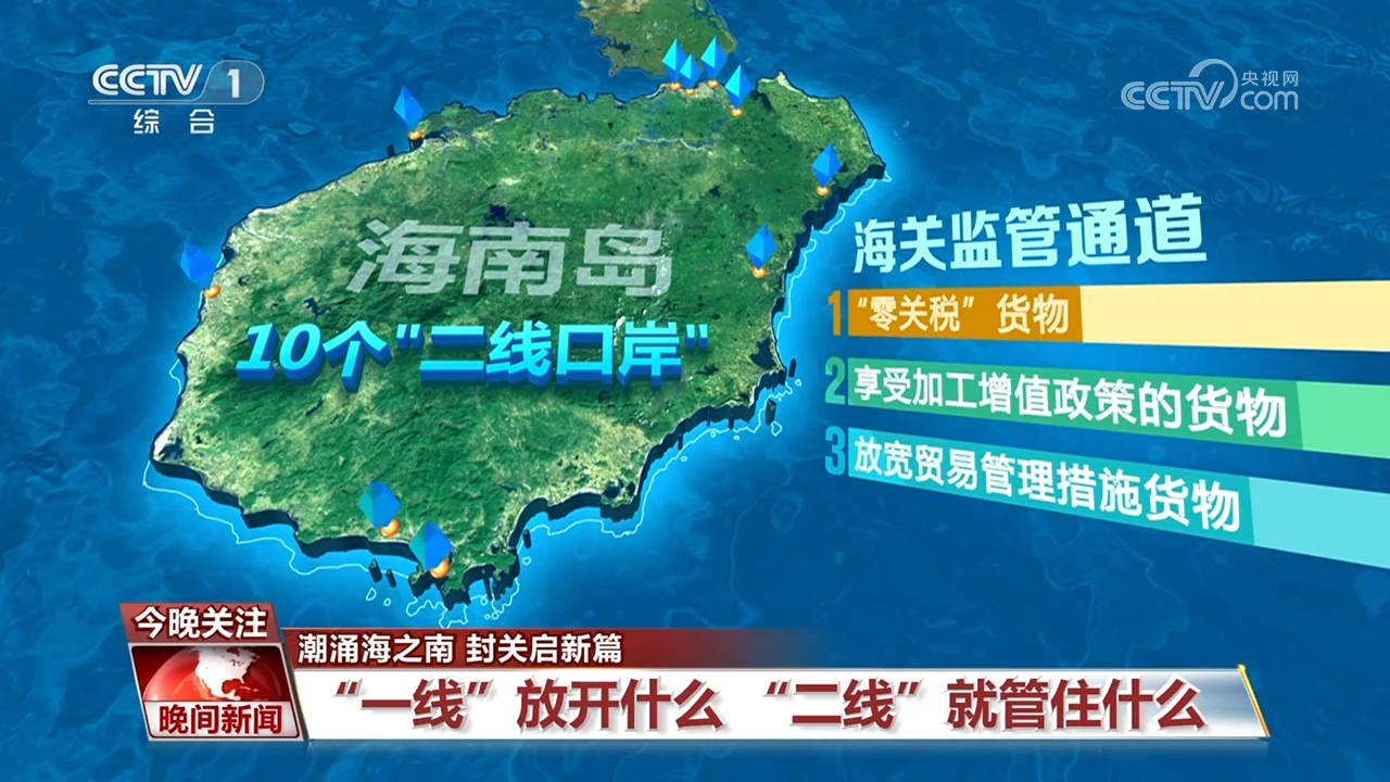 “二线”管住是什么意思呢?就是将海南自由贸易港与内地之间作为“二线”,“一线”放开什么,“二线”就管住什么。目前,岛内有8个“一线口岸”,对符合条件的进口货物径予放行。而10个“二线口岸”,会设置海关监管通道,专门管理“零关税”货物、享受加工增值政策的货物,和放宽贸易管理措施货物这三类货物。