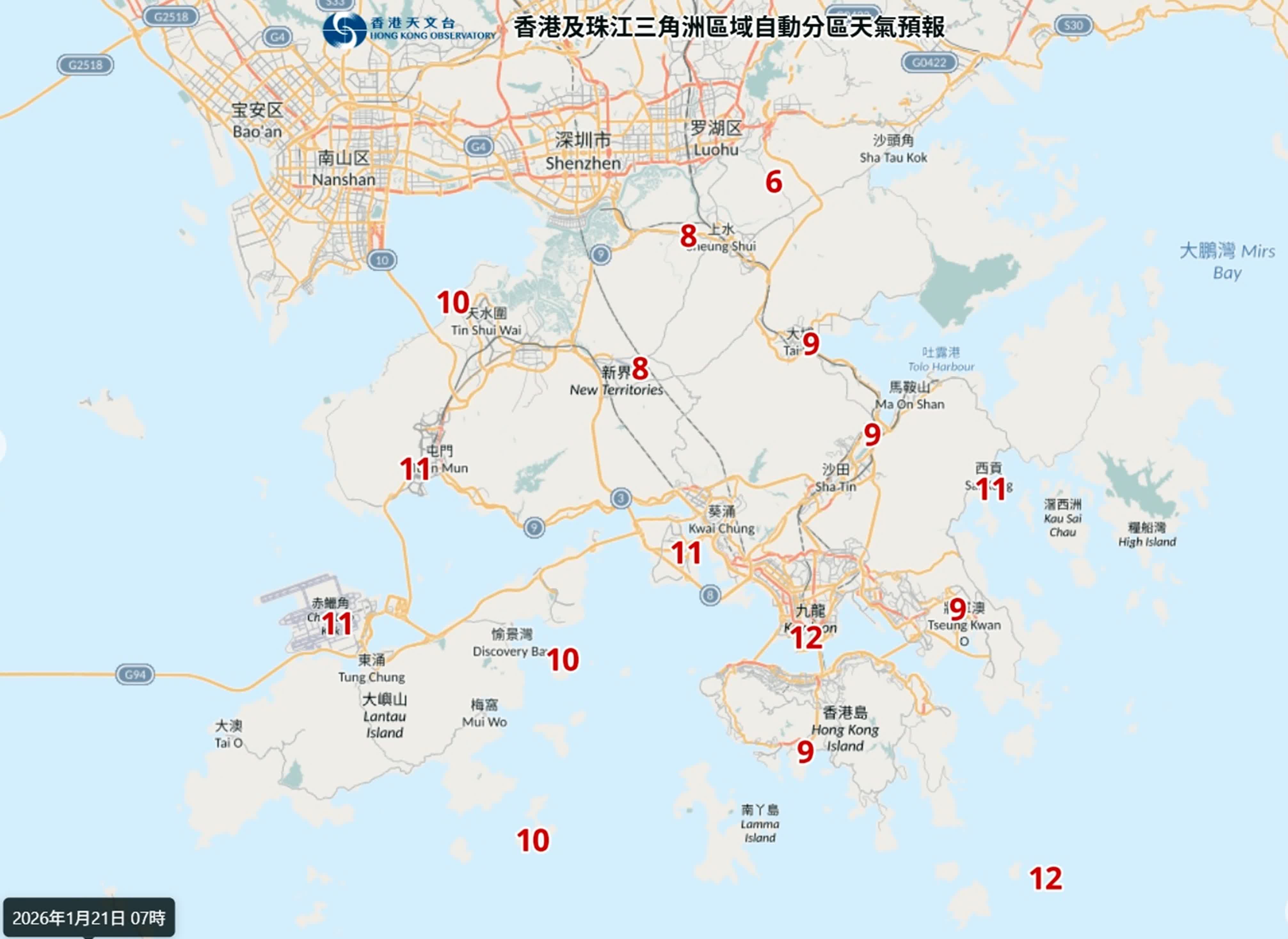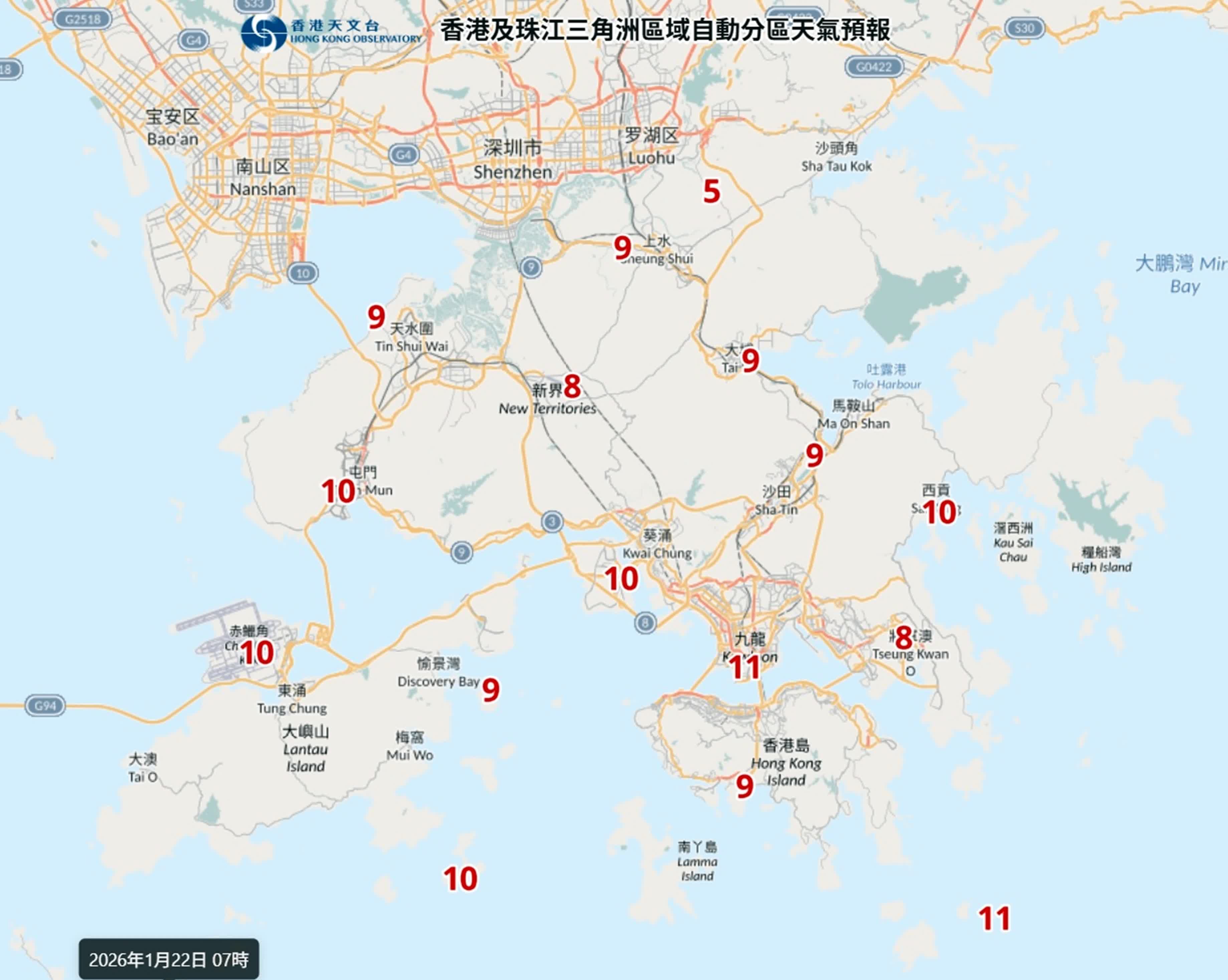 據天文台的九天天氣預報顯示,明日市區氣溫最低12度,最高17度,吹北至東北風4至5級,日間短暫時間有陽光及乾燥,自動分區天地預報則顯示早上7時,黄竹坑、將軍澳、沙田、大埔低至9度,上水、石崗降得8度,北區打鼓嶺更只有6度;周四(22日)市區氣溫進一步下降到11至15度之間,續吹北至東北風4至5級,當日早上7時新界多個地區亦跌至10度以下,黃竹坑、坪洲、沙田、大埔、上水及流浮山低至9度,將軍澳及石崗得8度,打鼓嶺更只得5度;至周五(23日)周五市區氣溫在12至16度之間,吹東北風3至4級,初時間中5級,早上寒冷,日間部分時間天色明朗及乾燥。