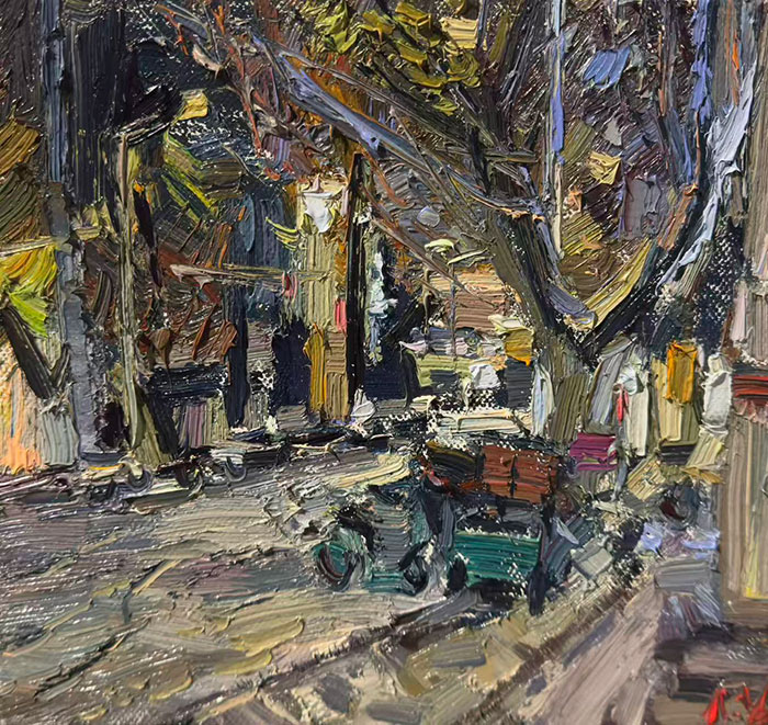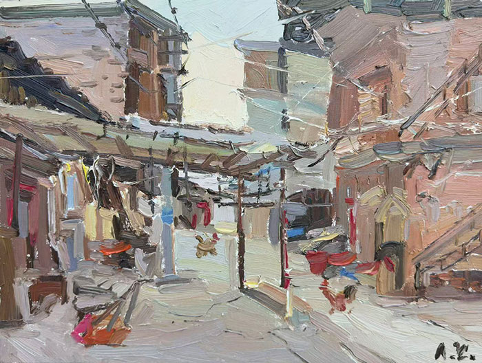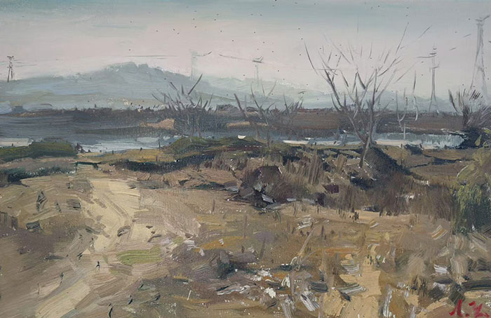 “相较于其他题材,风景中所展现的空间与形态的丰富性,为廖正定捕捉与组织点、线、面提供了充分的现场依据,并导向对画面抽象形式语言的探索。这种探索,源于廖正定在中国艺术传统、俄罗斯油画经典语言与现代艺术思想之间的思考。在中国艺术方面,他推崇吴冠中融合西方色彩与中国写意美学的路径。在俄罗斯画家中,他偏爱柯罗文,从这位游走于现实主义与印象主义之间的艺术家身上汲取形式与色彩上的启发。作为当代画家,他亦无法忽视二十世纪以来现代艺术所带来的观念更新与视觉冲击。因此,他对风景的描绘不仅限于写实再现,而是注重融入对平面构成与光影节奏的探索,在色调与笔触的平衡中,逐渐构建出一种介于二维与三维之间的画面结构,以此践行其个人油画语言的探索。”季海洋说道。