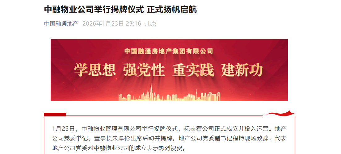 乐居财经 李兰 1月23日,据微信公众号“中国融通地产”,中融物业管理有限公司正式揭牌,标志着公司正式成立并投入运营。地产公司党委书记、董事长朱厚伦出席活动并揭牌。