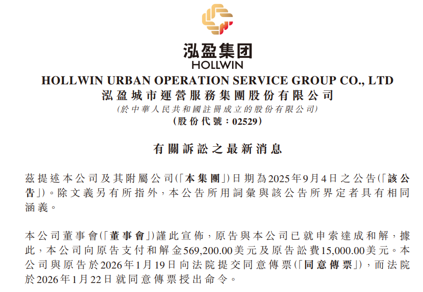 此次纠纷始于2025年9月,涉及泓盈城市服务2024年5月香港上市时产生的金融印刷服务费,原申索金额为61.52万美元。