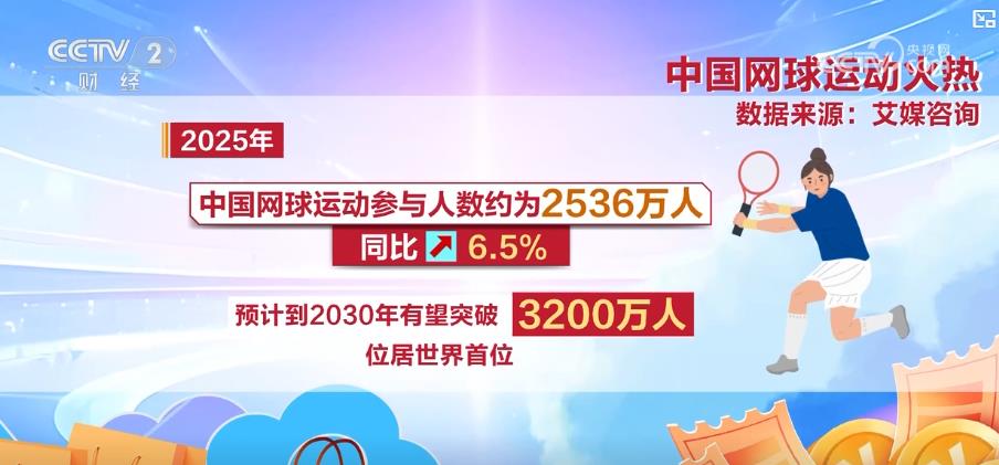 国家体育总局数据显示,2025—2026冰雪季首月,全国滑雪场累计接待客流量为0.35亿人次,消费额达363.5亿元,同比分别增长10%和6%,实现“开门红”。2025年中国网球运动参与人数约为2536万人,同比增长6.5%,预计到2030年有望突破3200万人,位居世界首位。