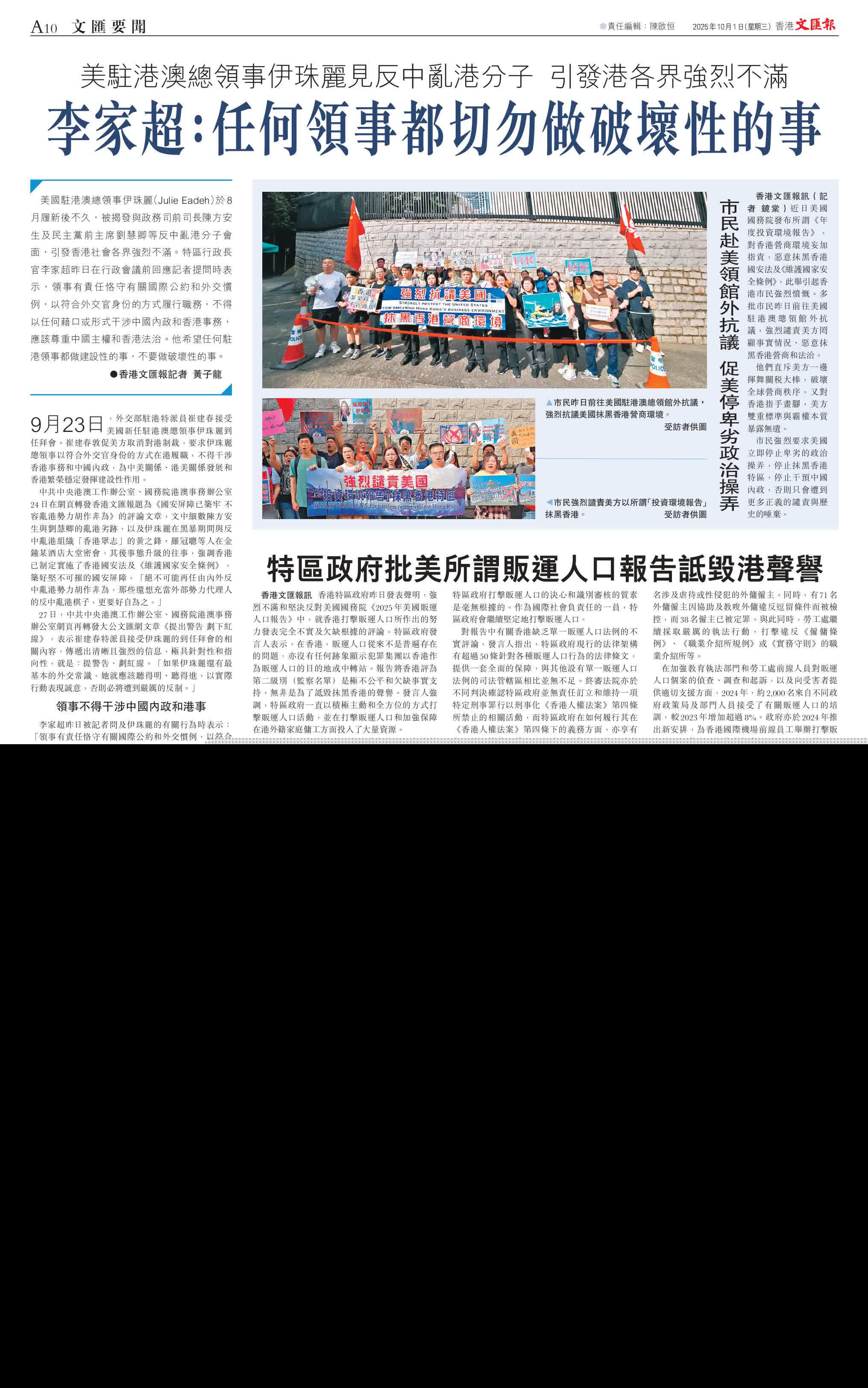 香港文匯報訊(記者 黃子龍)美國駐港澳總領事伊珠麗(Julie Eadeh)於8月履新後不久,被揭發與政務司前司長陳方安生及民主黨前主席劉慧卿等反中亂港分子會面,引發香港社會各界強烈不滿。特區行政長官李家超昨日在行政會議前回應記者提問時表示,領事有責任恪守有關國際公約和外交慣例,以符合外交官身份的方式履行職務,不得以任何藉口或形式干涉中國內政和香港事務,應該尊重中國主權和香港法治。他希望任何駐港領事都做建設性的事,不要做破壞性的事。