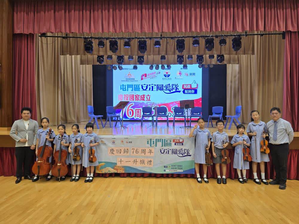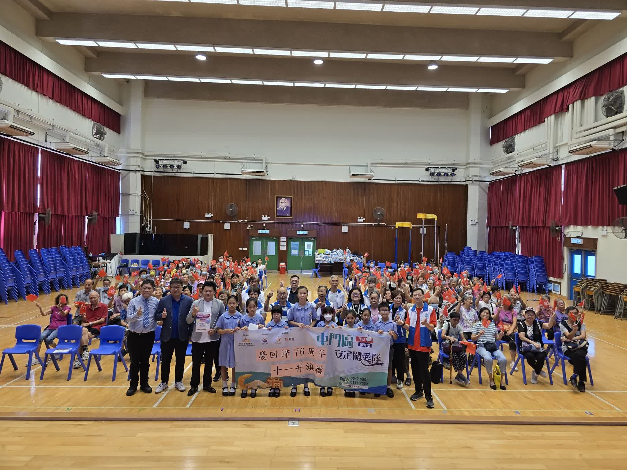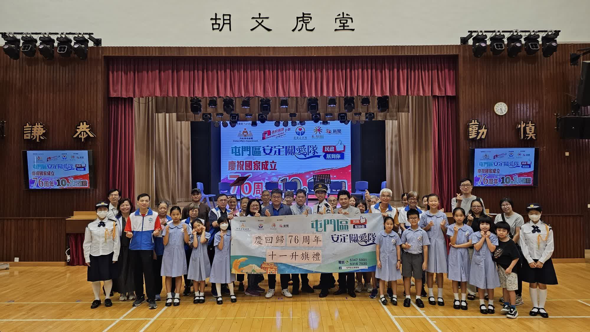 香港文匯報訊(記者 蕭景源)為慶祝中華人民共和國成立76周年,安定關愛隊今日(10月1日)早上在屯門兆麟街20號鐘聲慈善社胡陳金枝中學胡文虎堂,舉行慶祝中華人民共和國成立76周年典禮;該校升旗隊亦於清晨舉行升旗儀式。