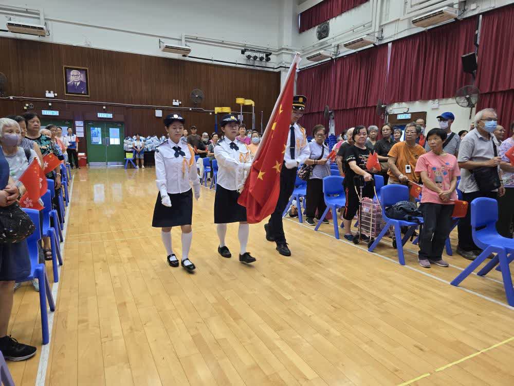 鐘聲慈善社胡陳金枝中學在facebook專頁帖文,升旗隊的學生們穿著整齊校服,邁著鏗鏘正步出場,國歌驟然奏響,當五星紅旗順著旗杆緩緩上升,學生和區內街坊們目光緊緊追隨著那抹鮮紅,嘹亮的歌聲在校園裡回蕩。當國旗升至頂端,風拂過旗面獵獵作響,學生和區內街坊們眼中滿是崇敬,愛國的熱忱在心底悄悄沸騰。