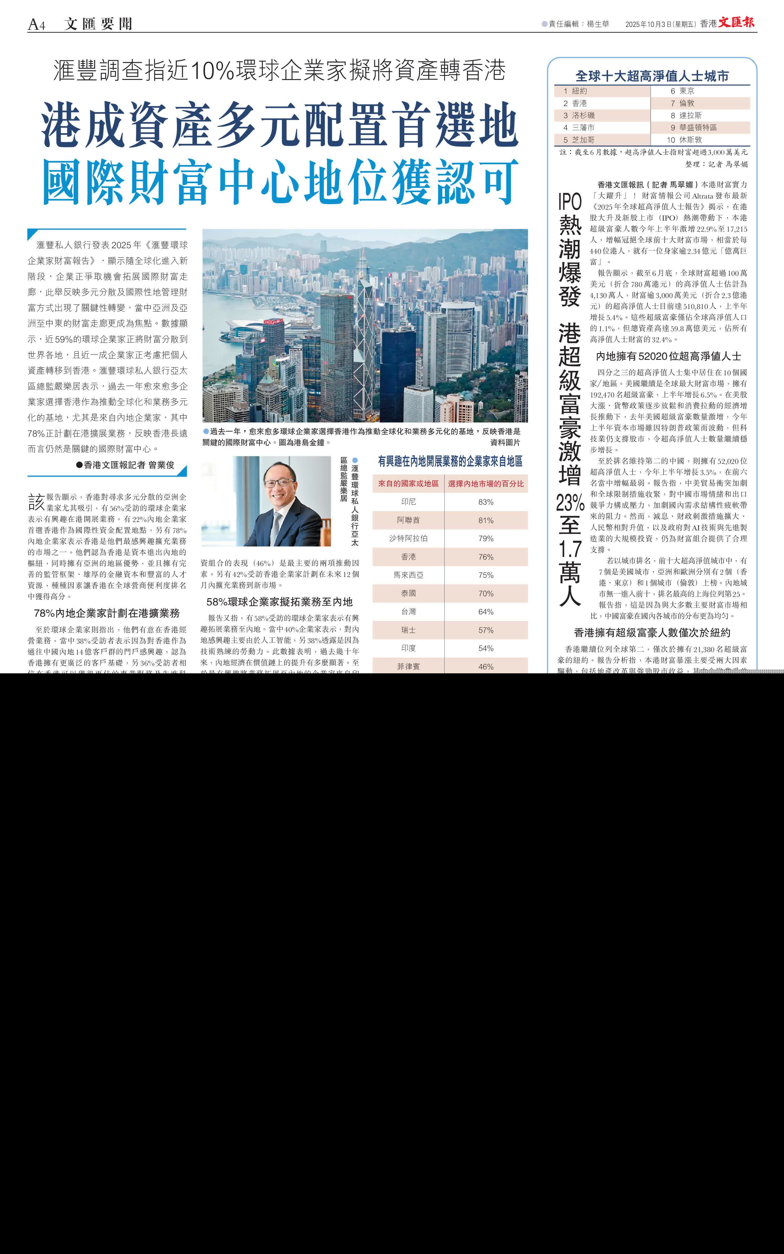 (香港文匯報記者 曾業俊)滙豐私人銀行發表2025年《滙豐環球企業家財富報告》,顯示隨全球化進入新階段,企業正爭取機會拓展國際財富走廊,此舉反映多元分散及國際性地管理財富方式出現了關鍵性轉變,當中亞洲及亞洲至中東的財富走廊更成為焦點。數據顯示,近59%的環球企業家正將財富分散到世界各地,且近一成企業家正考慮把個人資產轉移到香港。滙豐環球私人銀行亞太區總監嚴樂居表示,過去一年愈來愈多企業家選擇香港作為推動全球化和業務多元化的基地,尤其是來自內地企業家,其中78%正計劃在港擴展業務,反映香港長遠而言仍然是關鍵的國際財富中心。