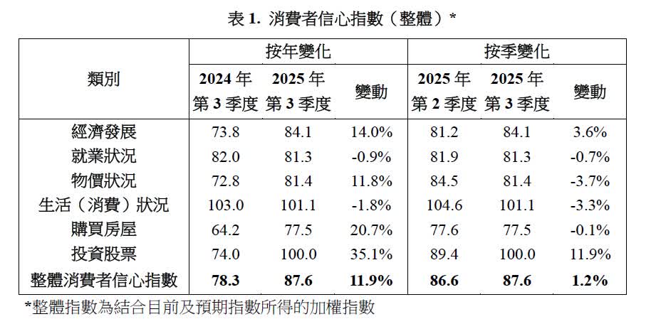 香港文匯報訊 香港城市大學(城大)決策分析及營運學系統計諮詢中心今日(8日)公布,今年第三季度香港消費者信心指數結果,整體信心指數錄得87.6,與上一季度相比上升1.2%,按年顯著上升11.9%。與今年第二季度相比,主要是由於消費者對投資股票和經濟發展範疇的信心水平均有所上升;消費者對投資股票的信心升幅最大,顯著上升11.9%,按年更升逾35%,達到分界線100分,顯示受訪者對該範疇的信心屬中性。