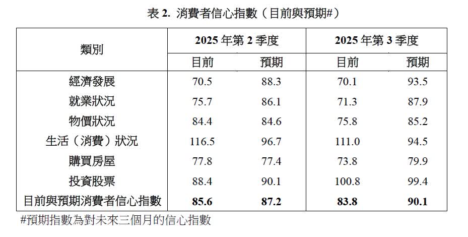 惟消費者對物價狀況和生活(消費)狀況的的信心均見下降,分指數分別下降3.7%和3.3%,但生活(消費)狀況的分指數仍為最高,接近分界線100分,顯示受訪者對該範疇的信心屬中性。