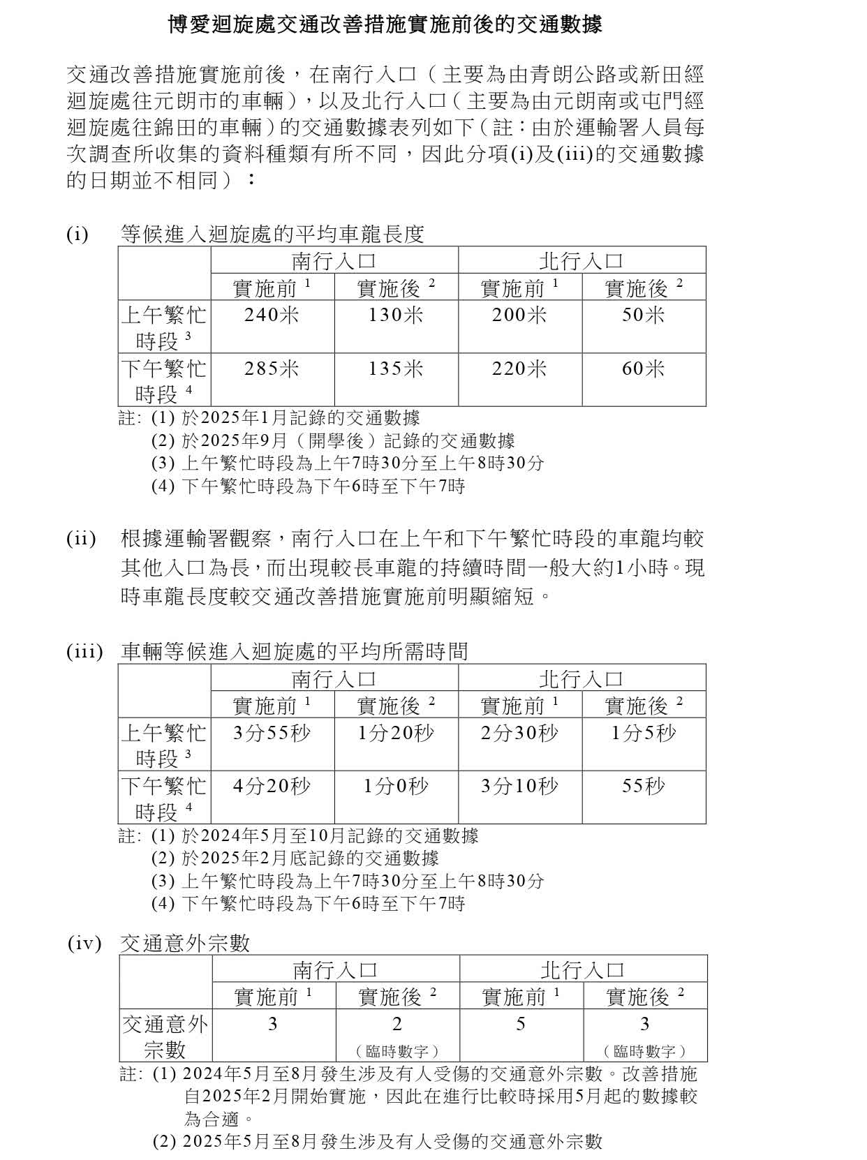 香港文匯報訊 元朗博愛迴旋處是新界西北車輛進出元朗市的要道,早上和傍晚上下班繁忙時段,行車時間較長。運輸及物流局局長陳美寶今日(8日)在立法會會議上指,元朗博愛迴旋處自今年2月上旬,加裝交通燈號系統及擴闊凹頭方向出口改善措施後,繁忙時段等候進入迴旋處車龍長度,大幅縮短最多160米,等候進入迴旋處平均所需時間亦由3分多至4分鐘,大減逾半(詳見下表)。