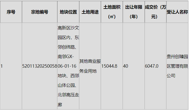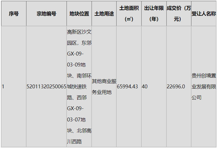 商业服务业用地方面,高新区沙文园区两宗地块表现突出,其中面积达65994.43平方米的地块以2.27亿元成交,由贵州创境置业发展有限公司获得。