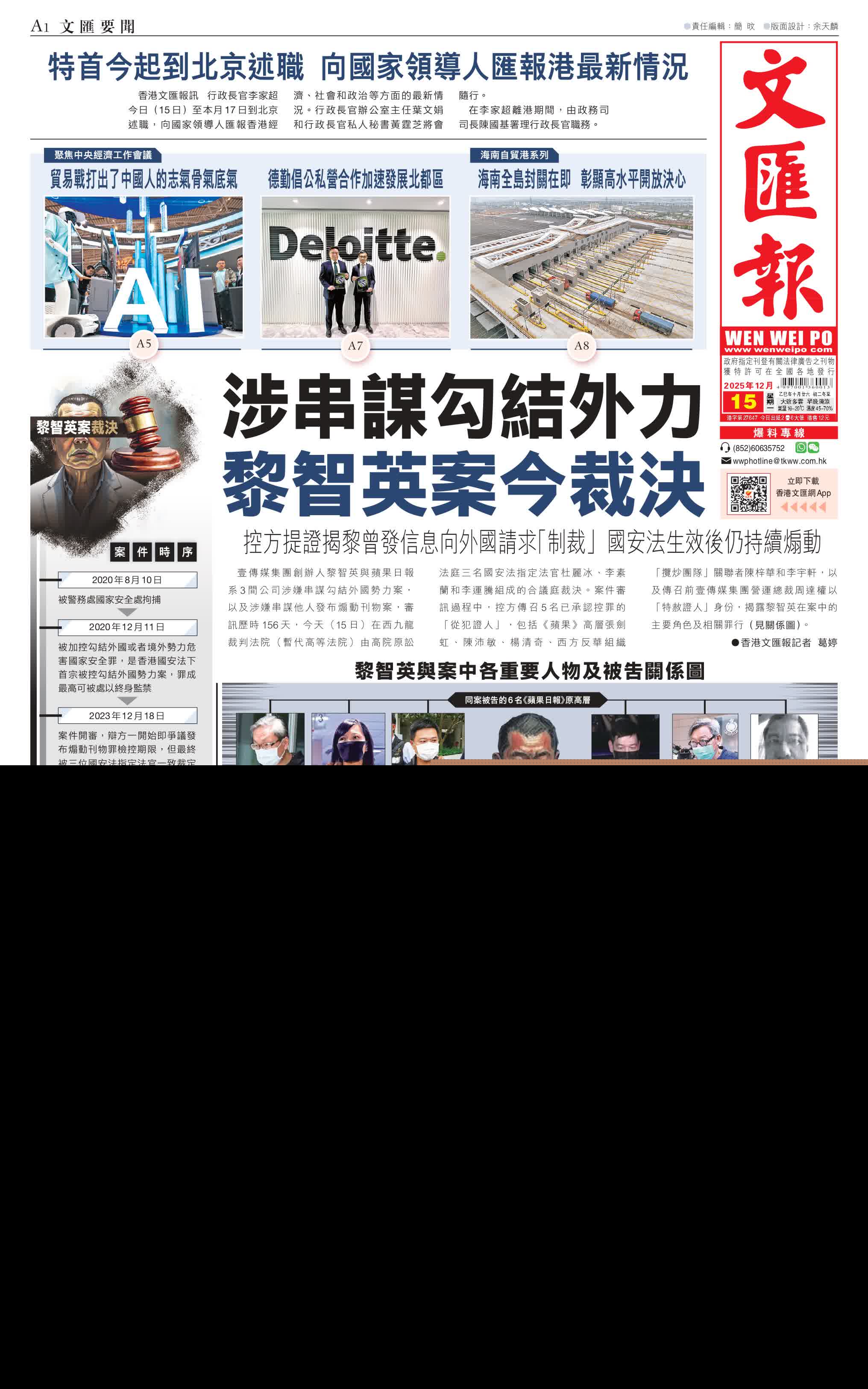 案件於2023年12月開審,去年7月裁定表證成立後,黎智英選擇出庭作供,歷時52日,本年8月控辯雙方完成結案陳詞,今天(15日)在西九龍裁判法院(暫代高等法院)由高院原訟法庭三名國安法指定法官組成的合議庭作出裁決。
