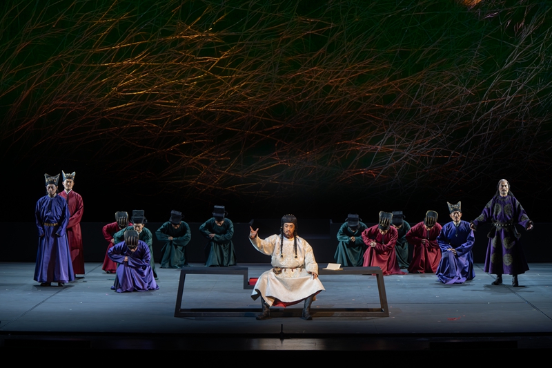 整部剧的舞台呈现以写意笔法勾勒出一部文明迁徙的壮阔史诗。舞美设计以高度提炼的视觉符号,兼具金朝古韵与“大象无形”的震撼力。舞台以移动的立体框架结构展现迁都的空间变化与戏剧冲突。烈火、宫阙等意象景片,伴随苍茫、悠远的音乐,营造出金朝迁都这一重大历史事件的宏大诗境。