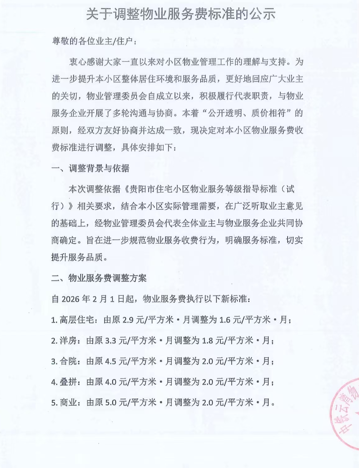近日,贵阳一小区印发物业服务费调整公告,大幅下调物业费,其腰斩幅度引发业主广泛关注。