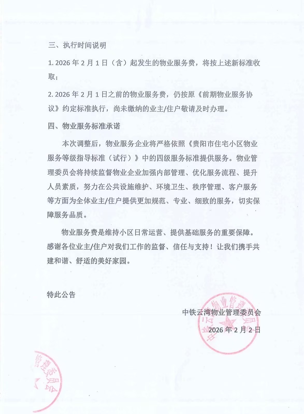 据了解,印发公告的是中铁云湾物业管理委员会,其宣布自2026年2月1日起已对该小区物业服务费收费标准进行大幅下调,高层住宅、洋房等各类物业收费单价均实现不同幅度调整。